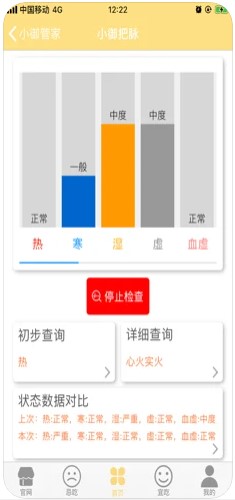 应用根据心率PPG波形图,把用户身体状态归类为五大状态,分别为:热、寒、湿、虚、血虚。
