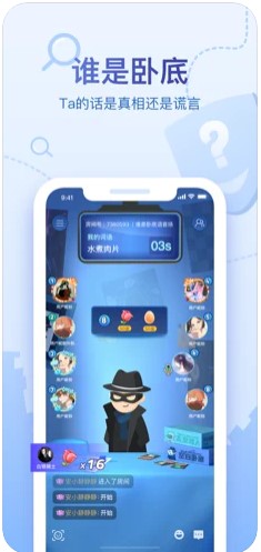 「狼人游戏」线下组局人不够?来“会玩”语音房,千万玩友在线联机,全程烧脑,期待一场真相与谎言的逻辑推理大作战!「你画我猜」随手涂鸦,互动解谜,你永远不知道会遇 见什么样的灵魂画手 ;「谁是卧底」《快乐大本营》最爱玩的明星互动游戏,线上也能玩啦,快来和卧底伙伴们大战300回合吧!
