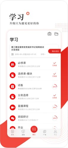 学习:可以查看学员参加的培训项目,通过培训项目可以完成课程学习的考核环节;