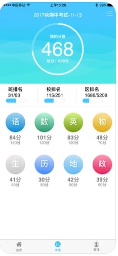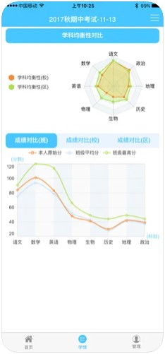 2、每一科的成绩都会很清楚的了解,而且也会有成绩对比分析可以在线查看;