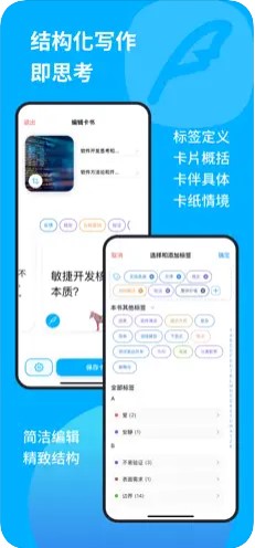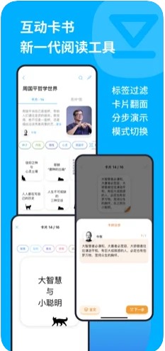 在主题卡书下,卡片翻面模拟认知世界的对立统一,多标签过滤实现内容快速筛选,卡伴step by step分步演示方便聚焦思考,模式切换实现整体和局部的思维转换。