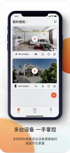 全橙看家,配合智能摄像头产品共同使用,您可以随时了解屋内、庭院、阳台等场所的实时视频,同时也可以快速浏览到摄像头自动监视过程中的录像,利用App,轻松实现多个产品同时监控或家人共同使用。