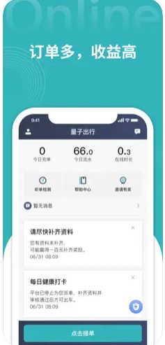 量子出行司机app是一款大家注册成为了司机用户就能轻松接单赚收益的软件,周围附近有了最新的订单信息,系统会第一时间发出通知消息哦,大家接单了之后,就可以直接按照乘客们的要求送往目的地即可,整个过程很简单,导航路线十分的精准。