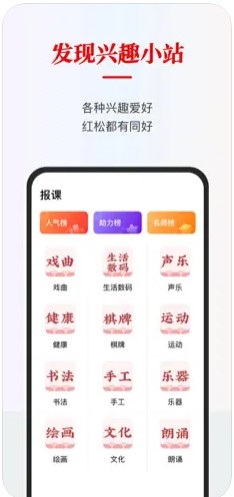 1、红松app提供优质课程、专属定制课表、在线交流群组、丰富主题活动等特色功能;
