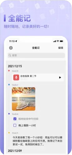 全能记app是一款功能全面的备忘录类软件。随时随地,将你想记录的文字,图片,视频,语音以及定位都得以妥善保存,更有备忘提醒让繁忙的你无一错漏!全能记app支持图文、视频、语音等多种记录方式,使用方便。