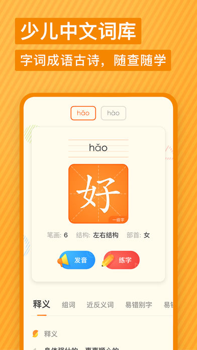 这是一款好用的词典应用,支持中文查字、英文查词。匠心打造,免费无广告。有道少儿词典依托海量的汉语及英语数据和智能化的语音识别技术,为6-12岁的儿童提供全面、权威的汉语及英语数据和智能高效的查询服务。欢迎下载使用。