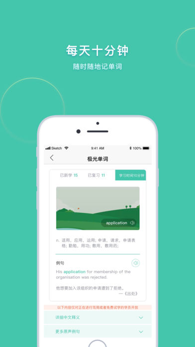 极光单词app是一款实用的背单词应用,通过全新的对赌背单词方式,有效激励单词背诵哦,背完就返现哦。每天轻松花上十分钟,记下所有单词哦。觉得有需要的就来下载使用吧。
