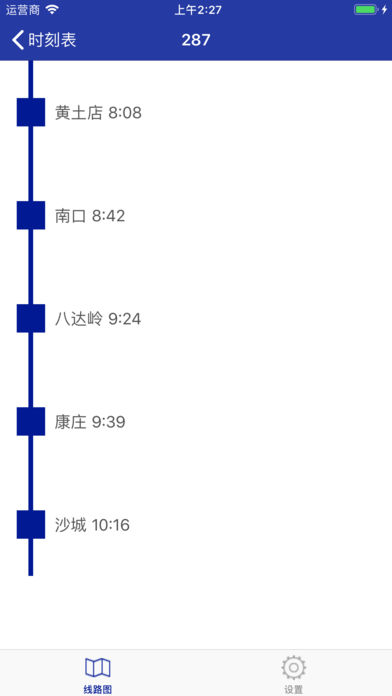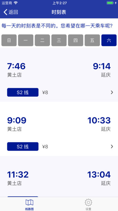 这是一款针对于北京市郊铁路S2线的一个应用,可方便北京南口及延庆居民以及其他游客查询使用,用户可以一键查看列车经过站点,各个站点的时间和价格表等,极大程度的方便了出行。