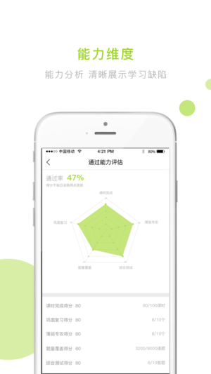 根据学生的整体学习情况进行综合分析后输出可视化数据分析维度图,就各学科考试通过率,综合评分,学习进度,错题难易度等多方面进行评估,让学生清晰了解自身过考能力在整体里的占比。
