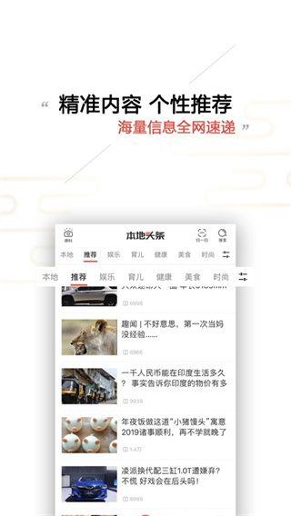 本地头条ios版是一款新闻资讯类应用。软件专为全国4.6亿县域用户倾心打造。有了这款本地头条ios版,就可以轻松掌握本地的发生的各种头条啦。没有时间看电视新闻和报纸的小伙伴可以直接点击手机app就可以家乡事件一键全掌握。软件平台365天,24小时全天候滚动更新,让你实时把握时间发展动态。这里有最热门、搞笑的视频新闻,海量资讯随心供用户观看。用户还可以订阅自己感兴趣的本地号、文摘号、美体号,更多热门随心订阅观看。感兴趣的赶紧来下载使用吧。