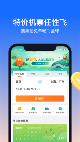 3、直销机票在线预订:票源来自各大航空公司,低价有保障。可随时随地退票、改签。