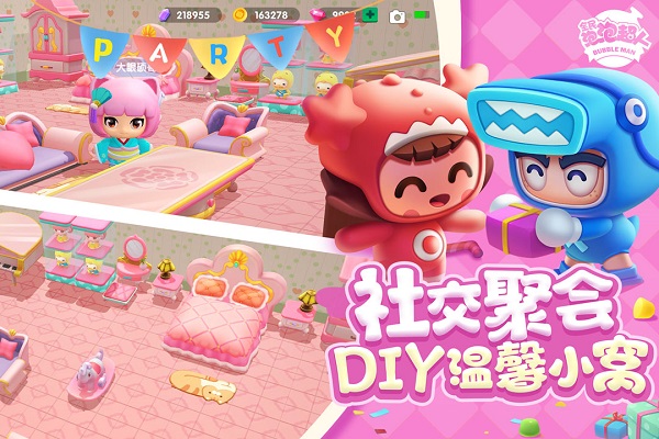 + 手游保留经典泡泡类战斗模式,以经典手游双轮盘操作,左手控制角色移动,右手控制泡泡、特殊道具、技能释放,玩家通过控制角色放置泡泡,并通过泡泡爆炸击溃对手!