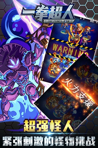 《一拳英雄》源自日本著名漫画,人物角色和场景百分百还原动漫剧情的手游大作。游戏讲述了原本是一名普通人的光头埼玉,为了追寻自己想要成为英雄的梦想,通过加入英雄协会拼命锻炼和晋级,终于脱胎换骨获得了最强的力量,与众多英雄一起开始了对抗各种怪人以及灾难的生活。战斗全场震屏大招、轻松一拳通关;游戏场景通过3D分镜技术,实现空中俯瞰整个战斗,一种全新的视觉体验。