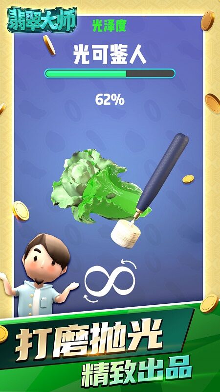 模拟真实原石挑选流程,手电照射、锯片开窗鉴定原石,考验策略和运气。切出翡翠,选定图样,滑动手指即可雕刻抛光,简单轻松易上手细腻的视觉特效,让人沉浸的音效和震感,还原真实的打磨体验。
