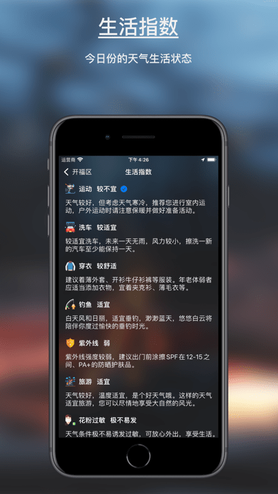 通过iOS系统优秀的后台更新机制,为大家提供灾害预警、空气质量和天气信息提醒。