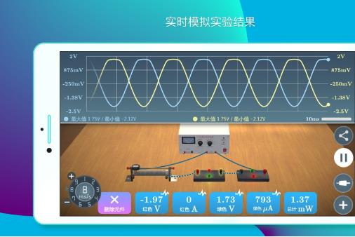 复现电路元件每个细节的仿真物理实验室,通过 25 种电路元件的自由连接,能够进行高精度中小学物理实验的开放应用。可以模拟实验结果,并且能够显示出电压、电流等信息,更有实时示波器支持。高精度引擎自动模拟计算,可以帮助用户更好的学习物理。