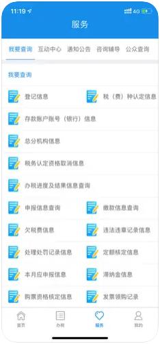 互动中心:提供消息提醒和完税证明查验功能;