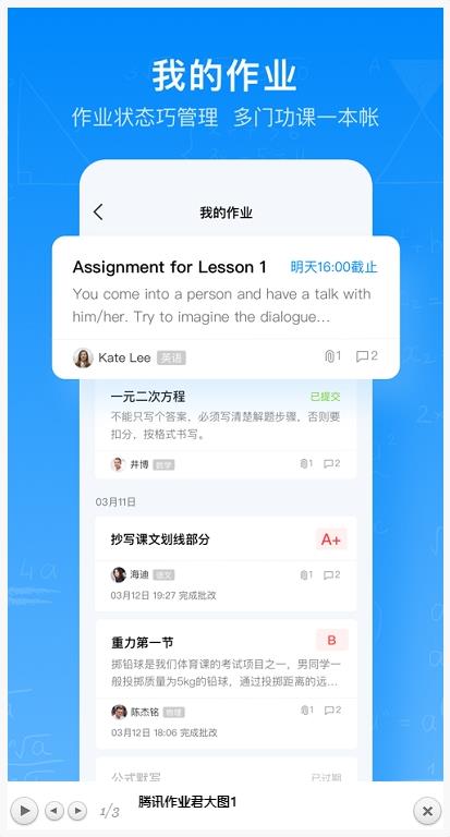 腾讯作业君app是一款十分好用的手机学习教育软件,用户可以在这里得到更加专业的学习,学生用户可以在这里进行作业的提交、习题的模拟等等,老师用户则可以在这里轻松管理班级、查看学生的作业完成情况 ,同时也可以在这里下发通知给同学!