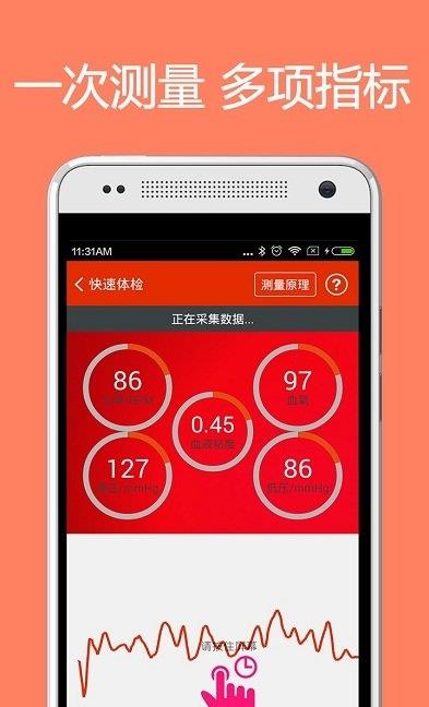 通过分析你指尖的血液流速来测量心率。这是安卓设备的心脏速率监视器。结果是即时的。实时检查您的心脏速率。无需任何外设,体检宝直接用手机测量用户的血压、心率、视力、听力、肺活量、心理指数、色盲等身体数据,并提供有针对性的可交互的健康方案。