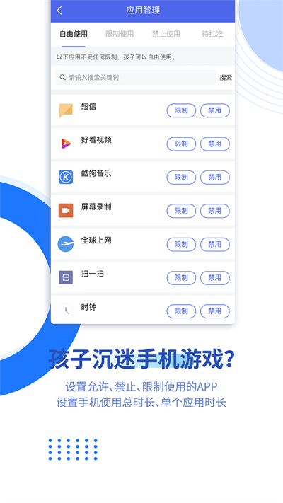 -【应用管理】:你来自由设定孩子应用的可使用时段和时长,帮助孩子脱离手机网瘾,个性化管理