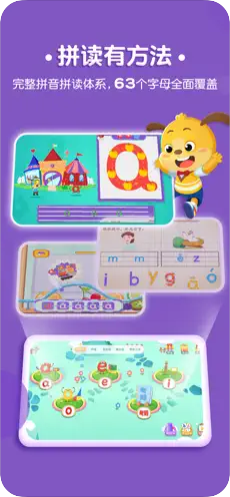 2、快乐学习:融合了笔顺、字母发音、汉字拼音,以可爱的卡通插图和高品质的动画,让小朋友在轻松的氛围下,掌握标准的拼音发音与拼读。