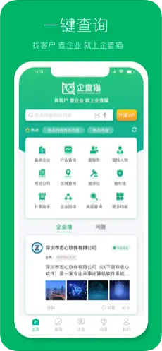 1、企查猫是款可以快速天眼查询企业和企业老板工商背景信息的强大企业查询工具。覆盖全国1.6亿+企业信息,为用户提供全面有效的企业大数据查询。只要输入需要检索的企业名或人名,就可快速查到企业的工商信息、联系方式、股东高管、股权结构、对外投资、商标专利、司法诉讼、信用状况、关系图谱、发票查询、变更状况、招聘信息、行政处罚等。