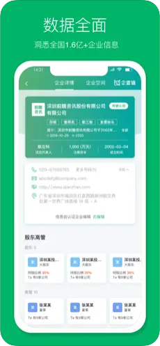2、在银行、证券、投资机构、国企部门、律师、媒体、记者等行业拥有众多忠实的粉丝。金融行业可以用于风险监控,国企部门可以用于招商引资,律师可以用于尽职调查,媒体可以深挖企业真相,采购可以寻找优质供应商,求职者可以了解雇主背景,销售可以发现更多销售机会等等,是各界人士必备的企业信息查询利器。
