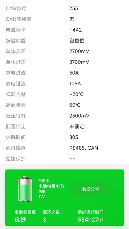按应用场景的不同可以对电池类型、串数以及电压、电流的各项报警值进行修改;