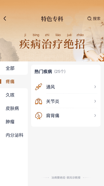 诊教授app为您推荐久咳、通风、肩背痛等疾病的疗法绝招,遵循中医古法,包罗万象、治病有绝招,有需要的小伙伴可以下载体验!