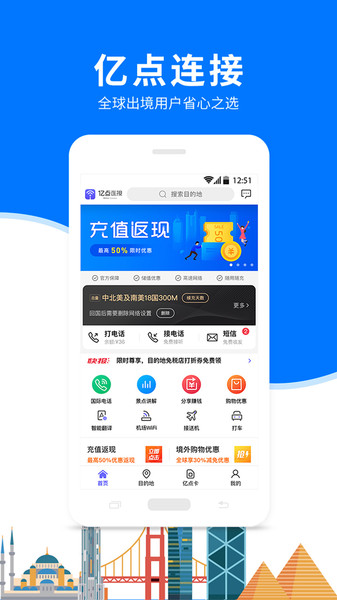 亿点连接app最新版是全球出境用户的省心之选,它可以帮助您十分方便的在境外使用手机进行上外,真正的实现一卡在手,全球任游,还有优惠的国际漫游套餐可以选择,让您在境外也可以用手机打电话!