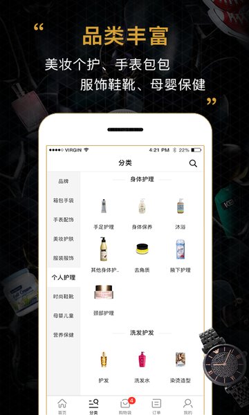 品类丰富:美妆护肤、个人护理、手表配饰、箱包手袋、服装服饰、时尚鞋靴、母婴儿童、营养保健八大品类;