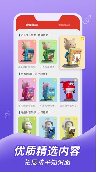 ·更多精选内容:海量扩充包不断更新,持续甄选适配1-8岁不同年龄段的国学、英语、艺术、宇宙、知名IP、知名绘本等各领域的优质内容,构建全面完善的内容体系,并根据孩子成长情况提供适龄的优质内容推荐,用优质的故事内容为孩子创建快乐的成长环境。