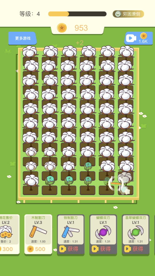 我爱摘棉花游戏是一款休闲减压小游戏。你将拥有一块棉花田,种植棉花种子、浇水、施肥、收获。虽然内容不算丰富,但是收获棉花的时候可有意思啦!用获得的金币购买各种不同的收割道具,能够大幅度提升你的收割效率。看着白花花的棉花被一点点收割干净,内心的畅快真的是无以言表呢!