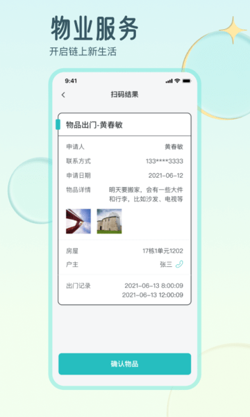 -物品出门:用于管理用户大件物品离园登记,支持线上登记生码,线下扫码出门。