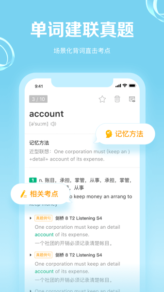 让我们来替你记住复习这件事——单词学完后,自动根据艾宾浩斯遗忘曲线推送复习提醒,并有复习日历帮你落实复习进度。再也不会忘记按时复习,单词从此不白背;