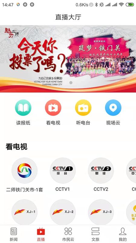 1、精彩的视听区,可以看电视、听广播、看直播和各种短视频。