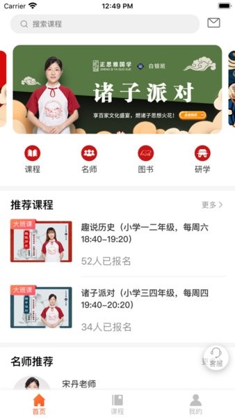 正思雅国学app包含了众多与国学相关的课程,支持在线买课和听课,可以查看详细的讲师信息和课程简介,支持在线筛选和查找自己感兴趣的课程,还能在线做作业买书和下载需要的学习资源。