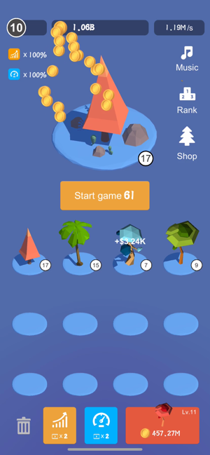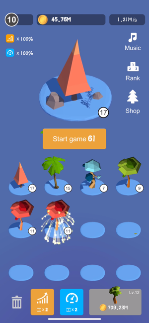 1、通过放置的玩法,玩家们收集各种金币,使用金币来解锁新的树苗和创建新的世界。