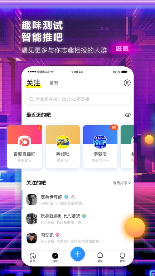 【体育赛事】获得关于体育比赛的海量内容,足球吧、曼联吧、篮球吧、NBA吧、田径吧、羽毛球吧、游泳吧...讨论精彩比赛、获取赛事新闻,从赛前预测到赛后分析,从明星选手到支持球队,与专业又有趣的吧友一起讨论、分享!