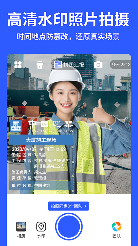 时间地点智能自动实时校准,拍照时自带水印,时间、地点、项目名称等信息。拍照片、拍视频均可使用。可拍摄高清水印照片、水印视频,真实还原场景。