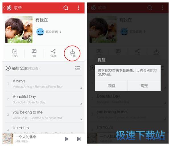 看到歌单页面第二栏的四个选项了吗,最右边的那个下载图标就是下载歌单的按钮,选择后会提示你是否下载整个歌单,当然也会告诉你歌单的歌曲数量和总大小。