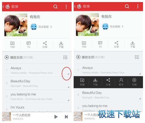 每首单曲后面都有一个右下角标的符号,就是那个灰色的小三角啦!选择便会出现对此单曲的操作,其中就包括了下载选择。