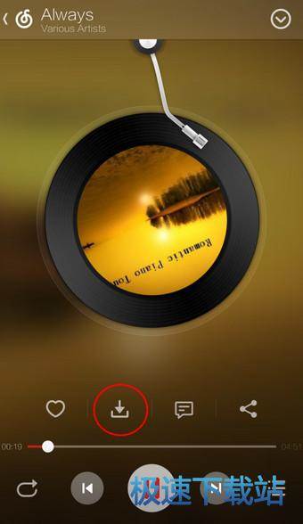 如果不着急,小伙伴们都会选择先试听一下,看是否对自己口味再决定下载。那么选择播放后,在播放界面,如果觉得好听,就可以点击“唱片”下四个选项中的第二个“下载”按钮啦!