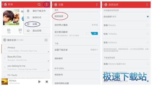另外,前面说了,网易云音乐提供高品质的在线播放和下载,如果想在下载时自动下载高品质的,那么在网易云音乐的一级和二级页面的右上角的设置里便可以找到音质选择的设置。
