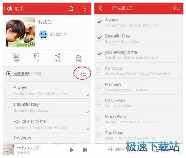 在歌单第三栏播放全部的末尾,有一个多选的选项,选择这里,便可以对歌单的歌曲进行批量下载,另外也可以对歌曲进行批量添加。