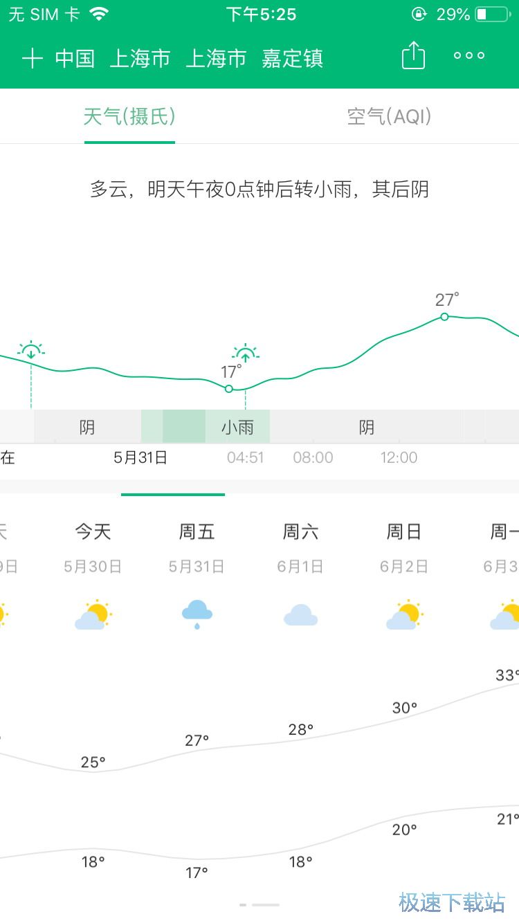 而在首页中往下滑动则可以在下方查看到未来的天气情况,滑动下方的未来下雨预报后即可进入到未来15天的天气情况查看,在这里我们可以滑动下方来查看各个日期中的天气情况,而滑动上方则可以查看到的降雨量的预测等等,根据个人需要滑动来进行查看即可,而点击上方的空气标签后则可以进入空气质量指数页面中进行查看,在这里也是可以通过滑动的方式来查看到未来日期中的每天的空气质量情况,我们就可以根据这里的天气来选择出行的时间,而往左滑动屏幕则可以退出当前的预测页面并返回到首页中。