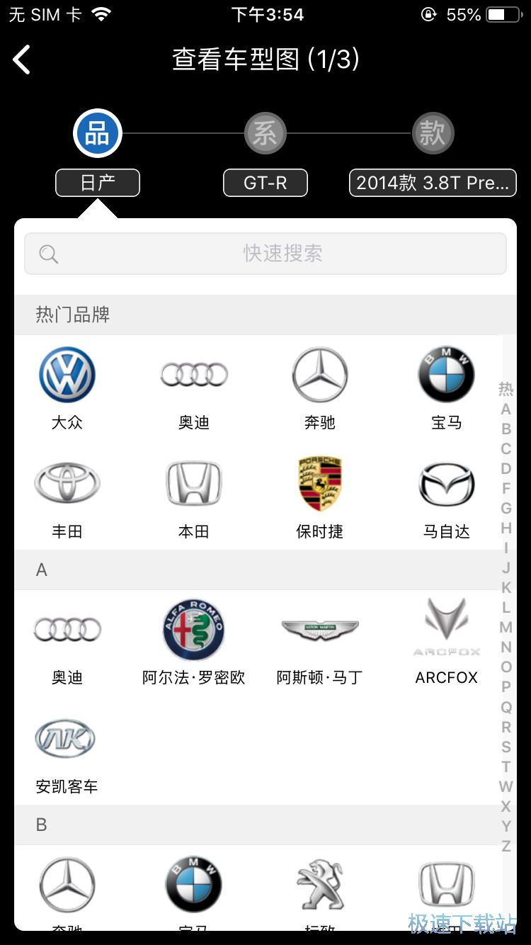进入车辆选择界面中可以根据车辆品牌的首字母滑动屏幕到下方点击需要车辆的品牌