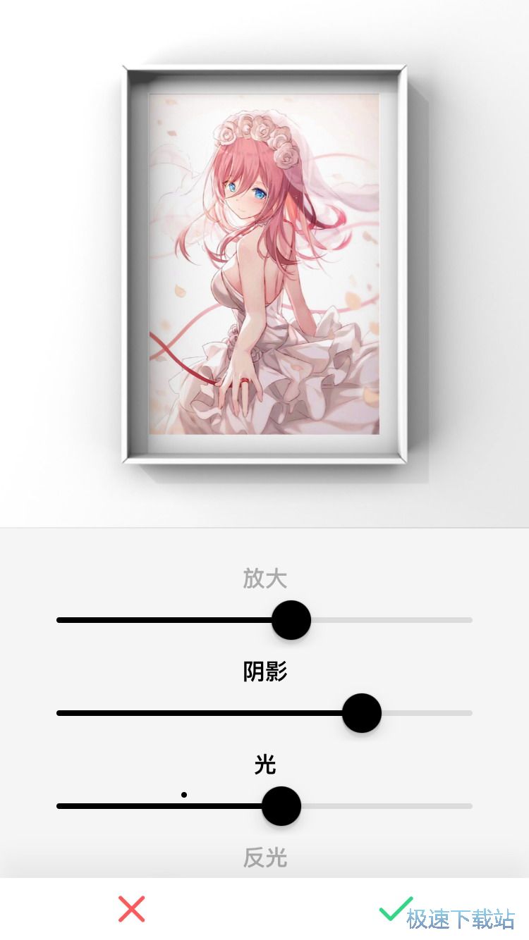 选择完成后我们可以通过再次点击该相框来进入到参数编辑页面中,在这里我们就可以根据个人需要来进行修改,滑动上方的阴影则可以在这里调整相框四周的阴影大小,往左滑动屏幕即可减少相框的阴影,而往右滑动屏幕则可以加大相框的阴影,根据个人需要来进行调整即可, 调整完成后我们还可以在下方调整亮度,左右滑动来进行调整即可,调整完成后点击右下角的图标即可完成保存。