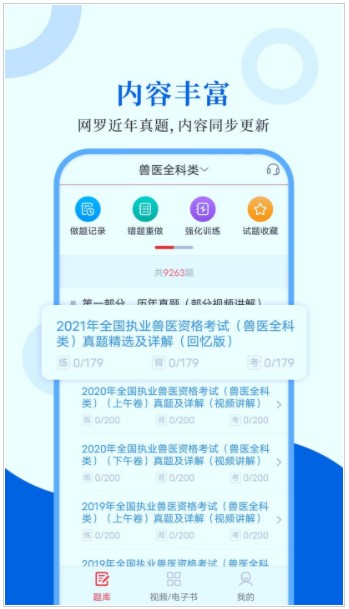 执业兽医各类考试配套辅导电子书、视频、题库、直播、红宝书、考点手册。记笔记,查答案,真题解析,视频讲解,语音朗读,知识点串联,让您学习无忧;历年真题,模拟考试,错题重做,强化训练,随机组卷,为您巩固重点;一对一辅导,考前冲刺卷,助您轻松过关。