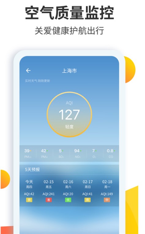 天气预报大师十分关注您所在地的空气质量,能够预报未来5天中 PM2.5、SO2、CO 等各类空气质量,以及您所在地的全国空气质量排名;